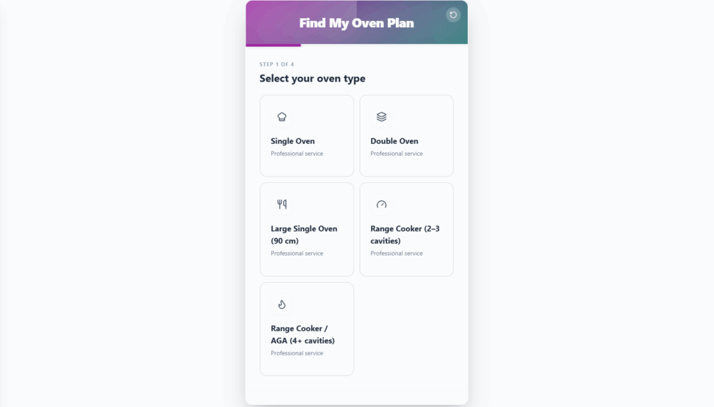 High-intent leads love a personalised experience. Our Quiz Builder allows you to create step-by-step questions (like our “Find My Oven Plan”) that break down complex services into a fun, interactive flow. This reduces “form fatigue” and sky-rockets conversion rates.