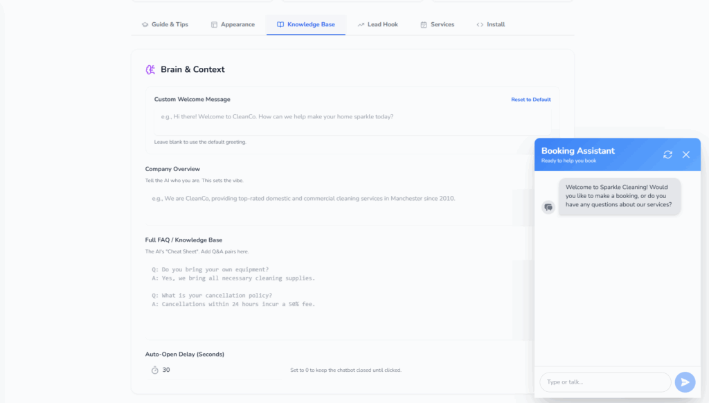Your website’s tireless employee. This bot doesn’t just take info; it answers questions using Google Search grounding and pivots back to the sale. If a customer asks for a service you don’t offer, it uses a “Lead Hook” to capture their details instead of giving them a dead end.