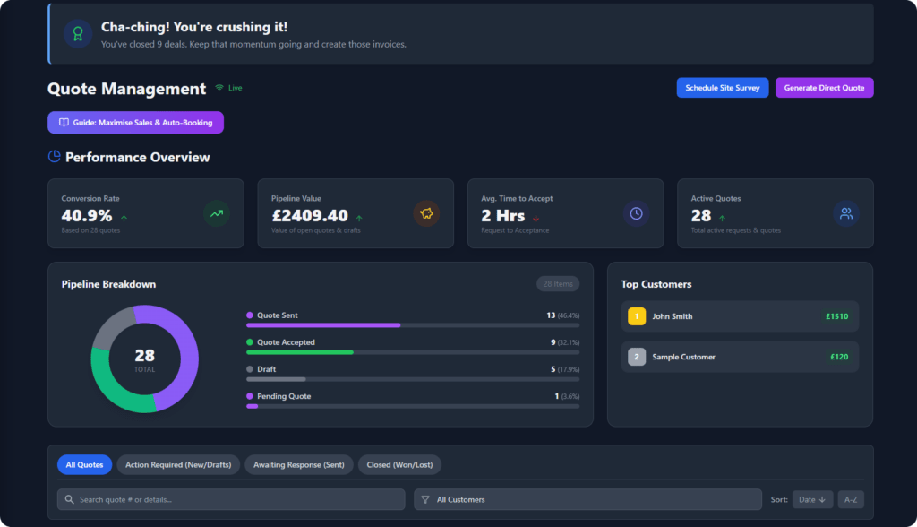 - Real-Time Alerts: If a customer opens your quote three times in one hour, they are marked as “Scorching”.