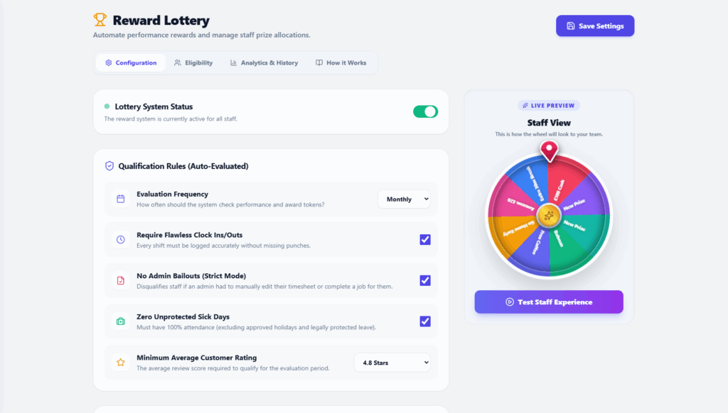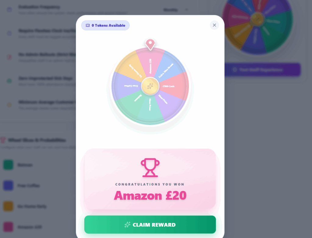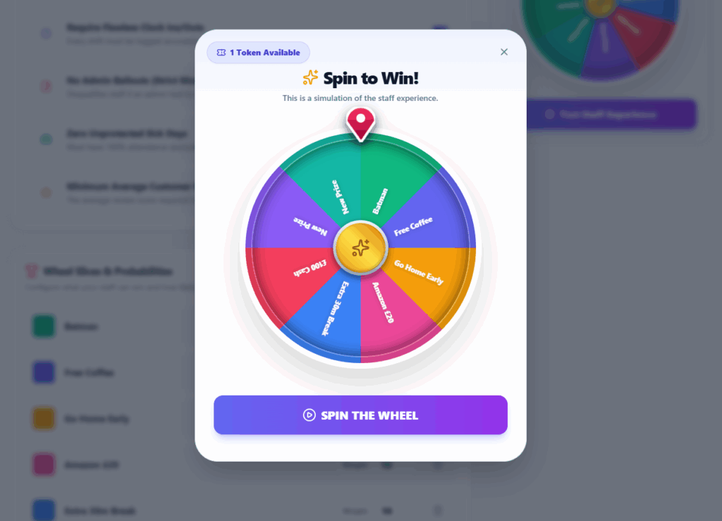 By automating the rules, you completely remove the friction of management. But the real genius is the psychological reward at the end. Because you can set the “Weight” of each prize, staff never know exactly what they are going to win. This variable reward creates a dopamine hit that standard cash bonuses simply cannot match.