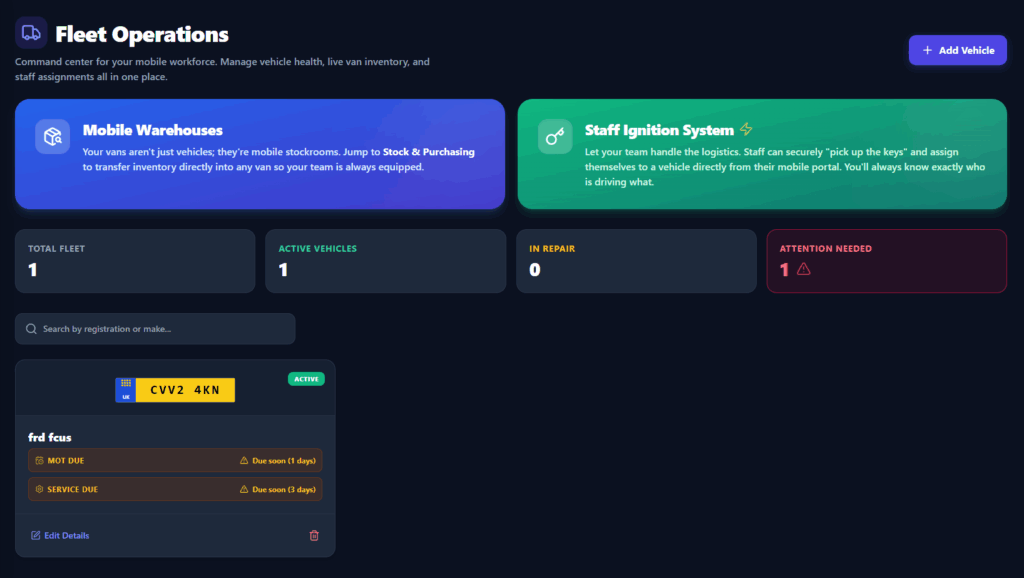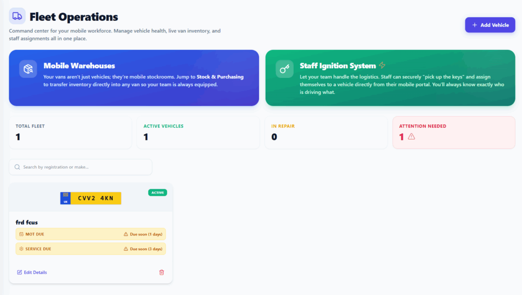 To eliminate the traditional bottlenecks of shift handovers and vehicle assignments, we have introduced the “Staff Ignition System.” This digital command center removes the need for physical clipboards and manual check-ins by allowing specialists to securely claim their vehicles through a mobile “ignition” process. The moment a staff member assigns themselves to a van, the office dashboard updates to show exactly who is in command of which mobile warehouse. This level of live visibility ensures total transparency and allows your dispatchers to focus on optimising service rather than tracking down keys.